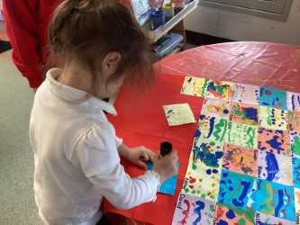 To extend our pattern work, the children explored colour mixing using paint. They experimented carefully, noticing how colours change when mixed together and then used their new shades to create their own patterns on square tiles. Once dry, the tiles were joined together to make a beautiful collaborative patchwork — just like Elmer!
