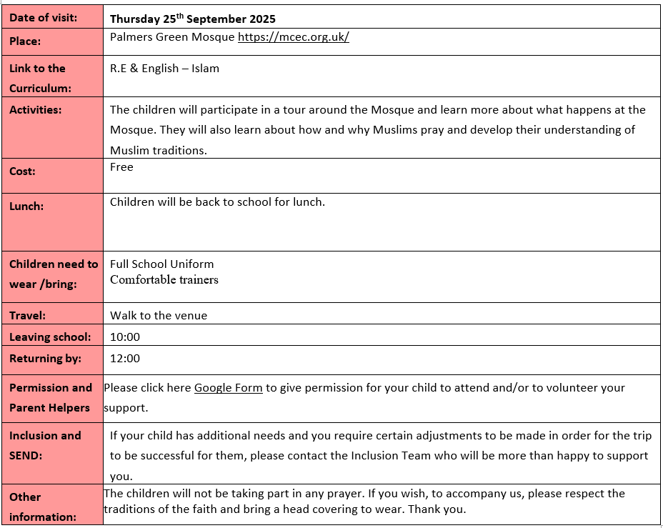 On Thursday, the Year 2 children, with the help of many willing parents, visited Palmers Green Mosque to learn all about Islam. The children sat and listened, showing our values of respect, resilience (they were sat for a while!) and appreciation and understanding, displaying their enthusiasm through asking many questions! See below for some photos of our trip!