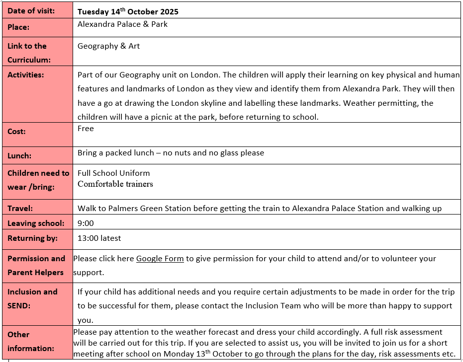 On Tuesday 14th October, Year 2 will be visiting Alexandra Park and Palace to sketch the London skyline and complete their Geography fieldwork, comparing physical and human features of our city.