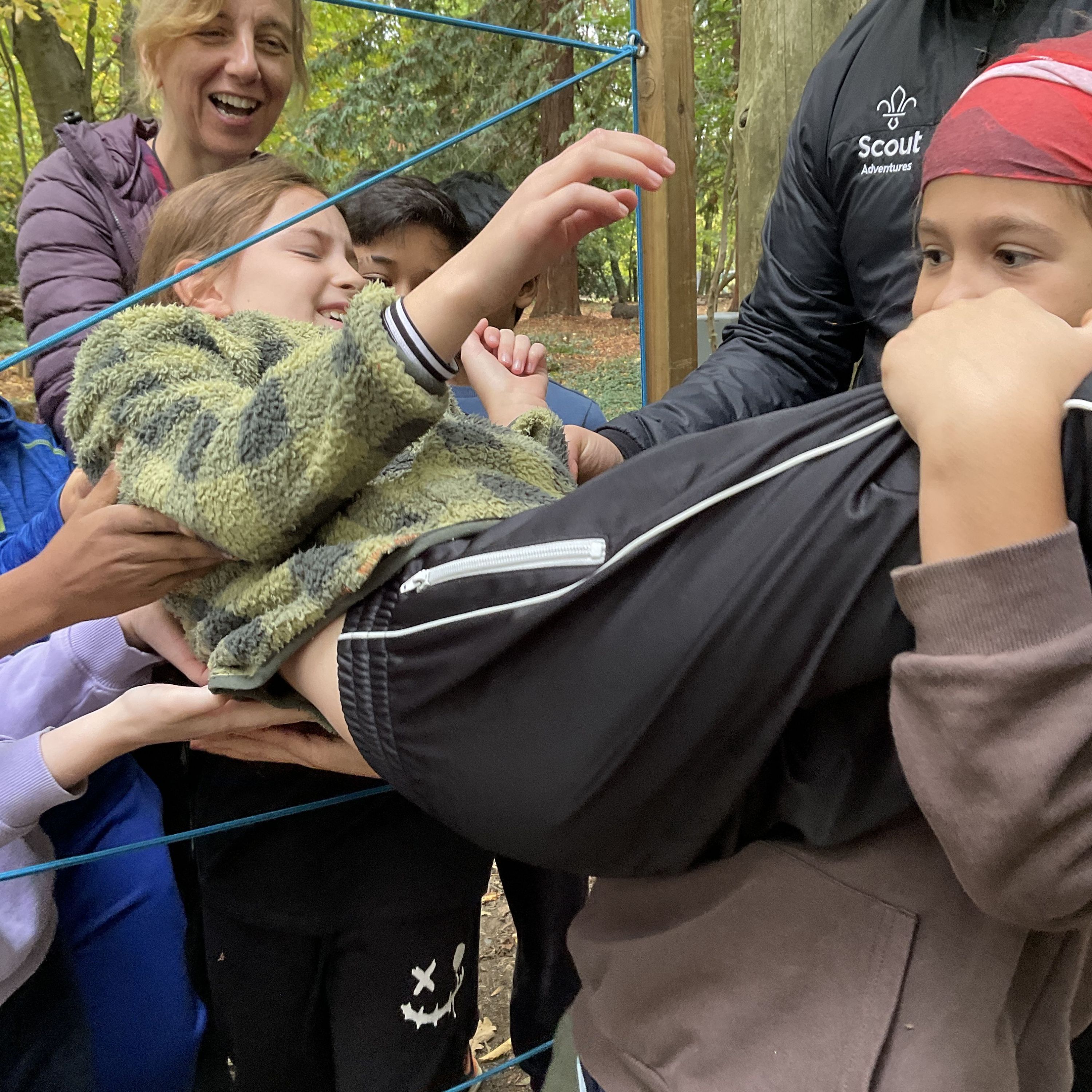 The next day was bursting with energy and teamwork magic! The children threw themselves into a series of thrilling team-building challenges like moving tyres to different poles, balancing balls on wobbly poles and shuffling carefully along a narrow bench to line up by birthday or name order. One of the highlights was the ‘scout scarf challenge’, where teams had to think creatively to pass the scarf across an ever-widening river!