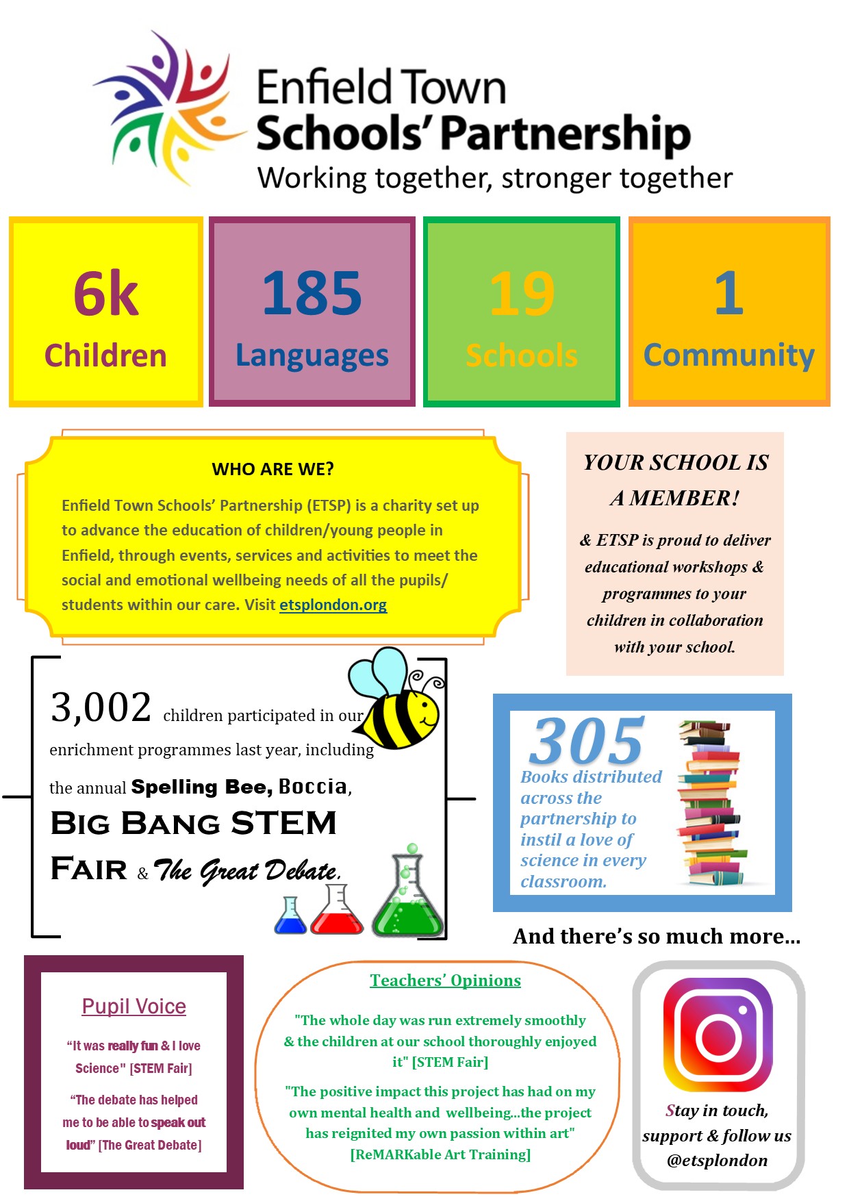 Hazelwood Schools is one of the newest members of the Enfield Town Schools’ Partnership (ETSP), a group of 22 Enfield schools representing over 7000 children within the borough, working together in partnership to improve the outcomes for all pupils and communities within the group.