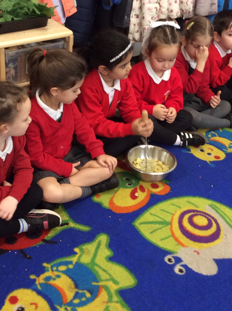Over the last two weeks, Reception have been listening to the story “Anna Hisbiscus’ Song”. Throughout the story, Anna visits each of her family members to show them how happy she is, and they share different ways of expressing their happiness: Grandfather counts the reasons he is happy; Uncle Tunde dances and her aunties pound yam. The children drew the reasons they felt happy on whiteboards, danced to traditional Benga music and pounded yam in class. Anna lives in Nigeria and the children began to compare what life is like in Nigeria to life in England. In the provision, they had lots of opportunities to further explore aspects of different African cultures. The children spotted similarities and differences between different countries through books and the small world; made and painted African necklaces and fabrics; created their own mango tree and explored fruits grown across Africa. They visited The Nest and worked in teams to follow a recipe to create Oven Baked Koose/Akara by blending beans, ginger and onion and baking them in the oven.