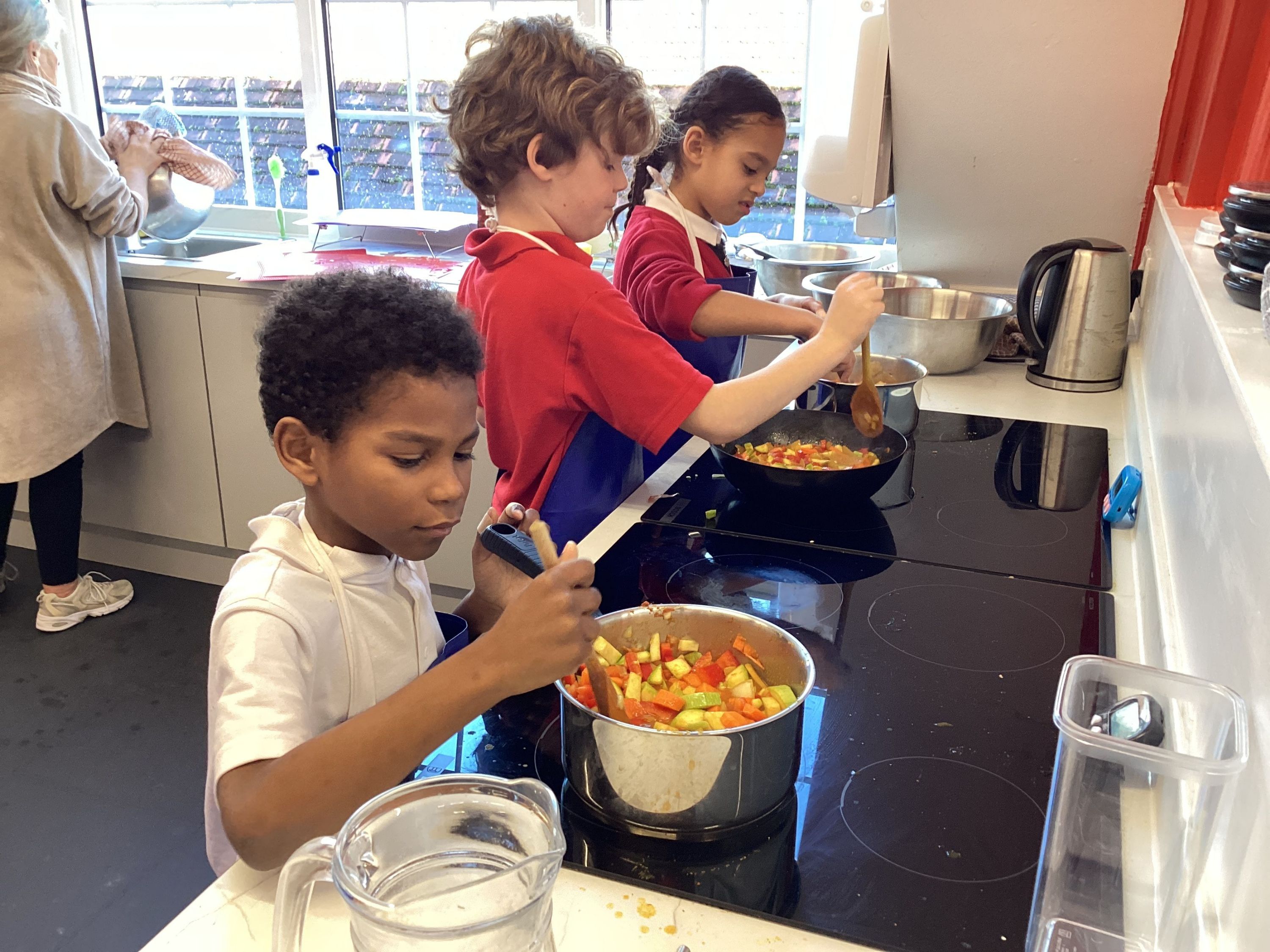 As part of their learning in Religious Education and PSHE, the children prepared a vegetable curry in The Nest, our school kitchen. They explored how vegetarian food is often offered to guests in mandirs, linking their cooking to their understanding of Hindu practices and values such as respect and hospitality.