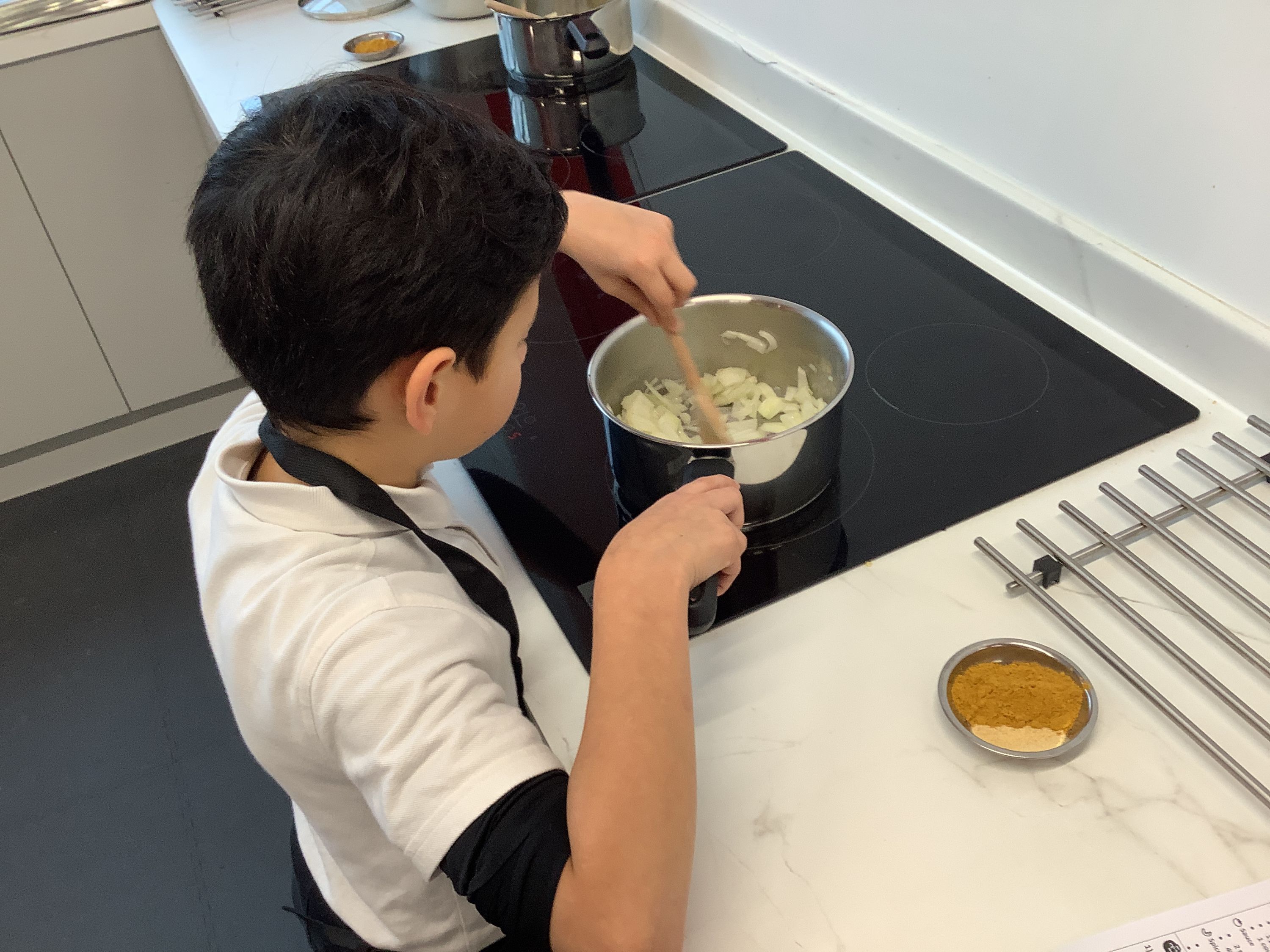 Before cooking, the children practised important food preparation skills. They carefully chopped a variety of vegetables, using the bridge hold and claw grip to handle knives safely and confidently. Working collaboratively, they cut the vegetables into small chunks and then followed a recipe step by step, cooking their curry on the stovetop. The children showed great teamwork and responsibility as they stirred their dishes, monitored the heat, and ensured nothing burned.